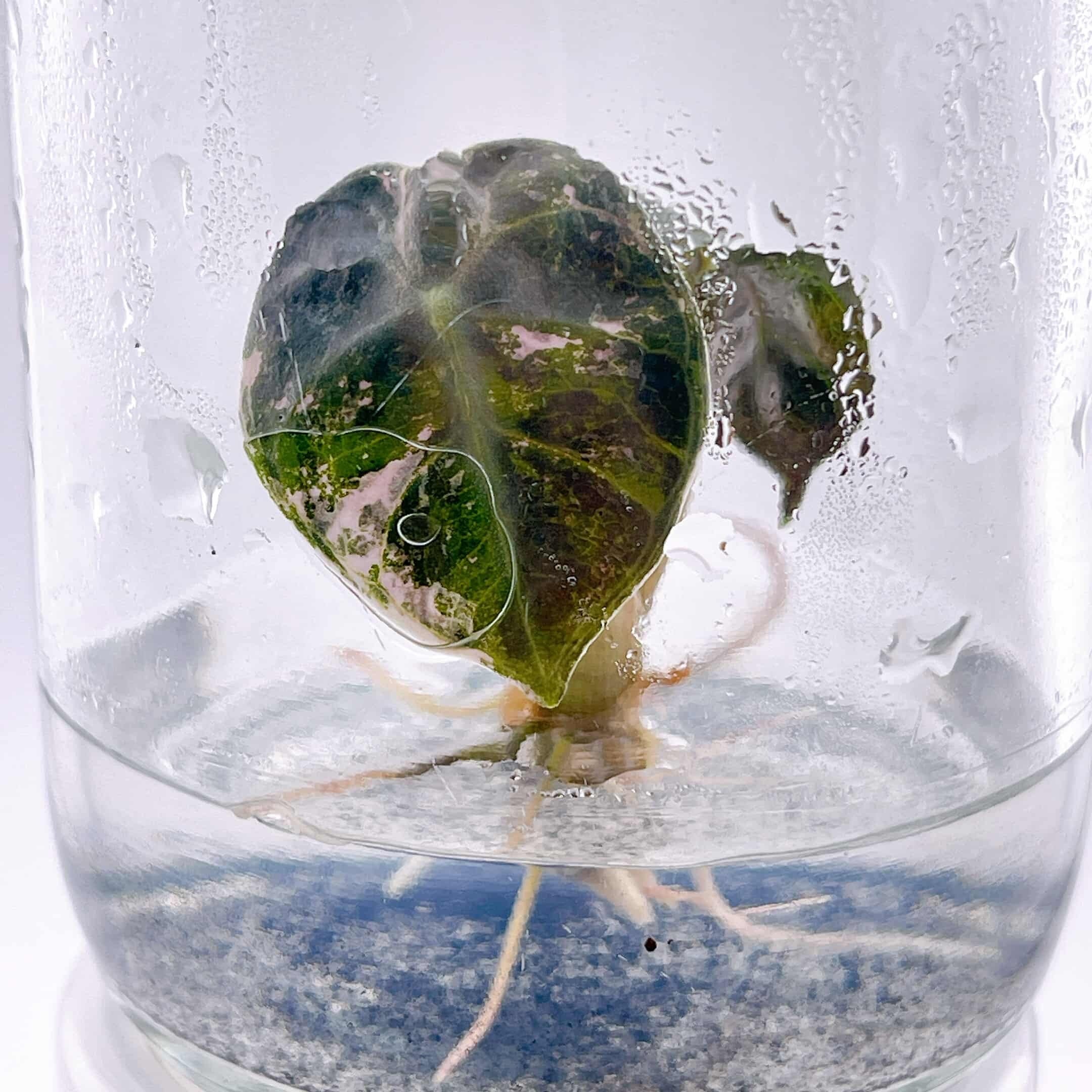 丸みのあるハート型の葉と、淡く滲むように入るピンク斑が魅力の希少アロカシア。