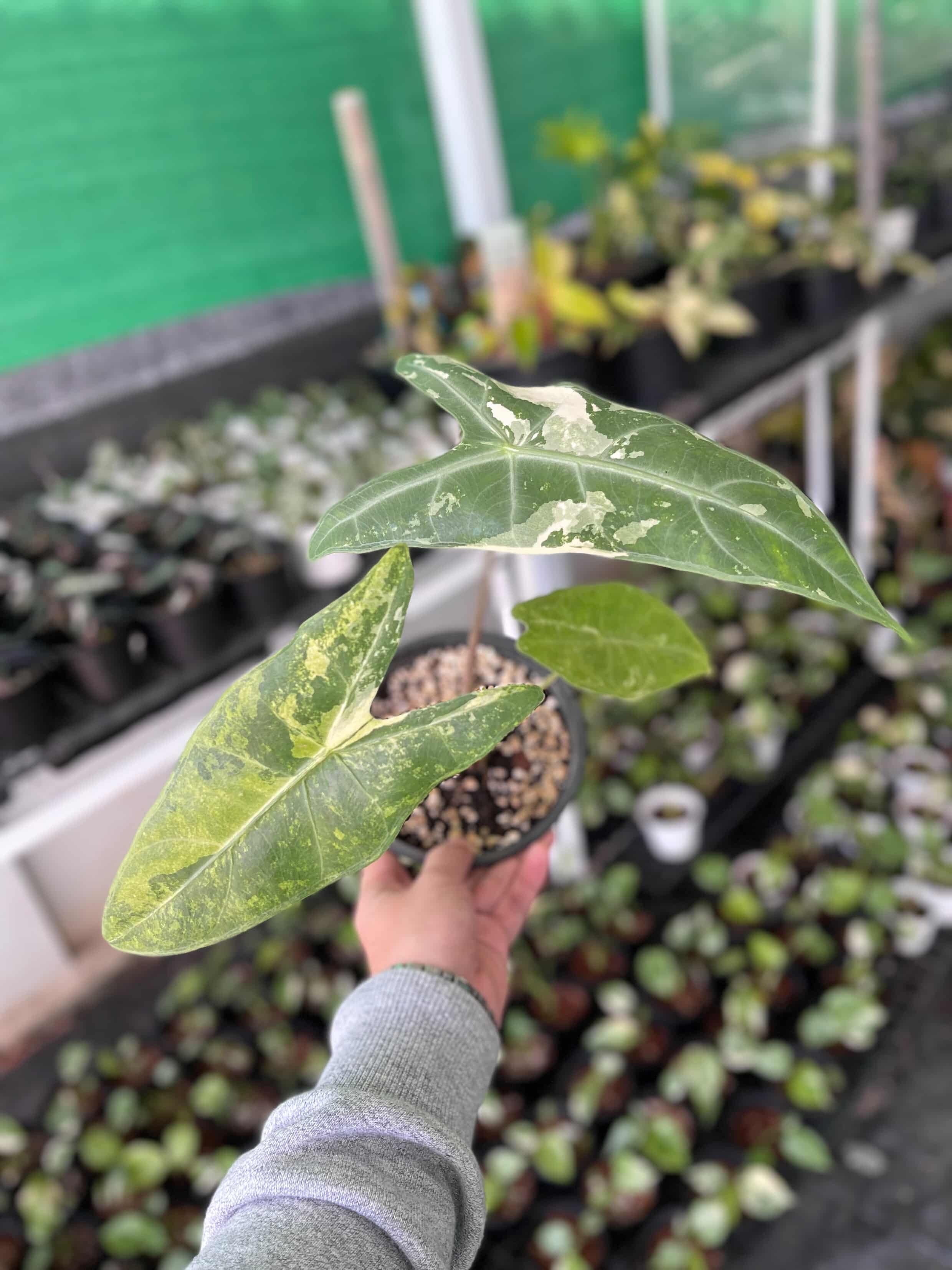 シャープで細長い葉形と、コントラストの効いた純白〜クリームの斑が映える希少アロカシア。